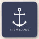 Portas copos náuticas minimalistas modernas com âncora branca com nome personalizado no estilo de fonte branco moderno sans serif em fundo azul marinho.