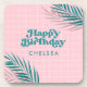 Jogue uma festa de aniversário pela piscina com estas modernas portas copos de piscina inspiradas. Ele apresenta um azulejo de pátio rosa, folhas de palma e tipografia inspirada na safra.
