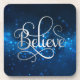 Esta porta copos dramática e elegante é bela durante a época natalícia, mas pode ser adequada durante todo o ano. Apresenta uma escrita de prata que diz "Acredite" contra um céu azul noturno com estrelas azuis brilhantes. Bonito!