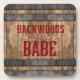 Legal porta copos de cortiça para aqueles que vivem no campo a vida apresenta "Backwoods Babe" angustiado texto vermelho escuro com rico florescendo sobre um fundo de madeira de barril de uísque.