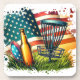Uma ilustração ai de um cesto de golfe de disco, uma garrafa de cerveja e uma bandeira americana.