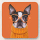 Esta fotografia Getty Images bonita apresenta um Boston Terrier com óculos laranja e suéter.