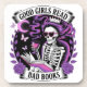 Um design vibrante e colorido mostra um esqueleto feminino lendo um livro enquanto bebe um coquetel furado. Ao redor dela estão flores roxas e borboletas, somando-se a estética viva. O texto ousado e colorido diz: "As boas meninas leem livros ruins." Esse design exclusivo está disponível em uma grande variedade de produtos.