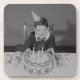 Menino (6-7) que senta-se na mesa com bolo de aniversário, marcas do retrato | George | AssetID: 82251245