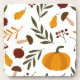 Uma arte popular inspirou um padrão de abóboras de dois tons, romãs, peras, cogumelos, folhas e bagas vermelhas.