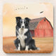 A great coaster for ranch houses, western decor and dog lovers alike, a Border Collie dog sits in a field at the ranch with a red barn and birds in flight in the background for a great country western cowboy theme.