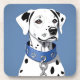 Um cão Dalmático digitalmente ilustrado com manchas pretas, vestindo um na moda azul, exibido contra um pano de fundo azul correspondente. Representação elegante e artística de uma raça popular de cães.
