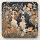Design com dois elegantes cavaleiros Cavalier King Charles Spaniels - um Blenheim e um Tricolor - num jardim exuberante, num estilo que lembra uma tapeçaria antiga ou o trabalho de William Morris.