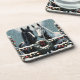 Bonito portas copos de Natal com gráficos de um cavalo branco e de um cavalo preto parado numa estante de madeira decorada em passas de férias e bonito luzes de Natal cintilantes cobertas de neve. Estes cavalos são feitos em um estilo de arte pop de quadrinhos para invocar um sentimento nostálgico.