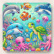 Uma vibrante ilustração submarina mostrando diversos animais marinhos, incluindo golfinhos, tartarugas marinhas e polvos, entre corais e bolhas, promovendo felicidade e beleza da vida oceânica.