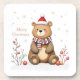 "This adorable illustration features a cheerful brown teddy bear wearing a festive red and white Santa hat and a cozy striped scarf. The bear has rosy cheeks and a soft, plush look, making it incredibly inviting. This charming graphic is perfect for children's Christmas apparel, holiday cards, ornaments, cozy blankets, or any product celebrating the sweet and simple joys of the holiday season."