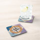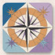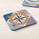 Esta porta copos apresenta um rosa de bússola estilizado com um padrão geométrico num fundo gradiente. A estrela rosa central da bússola tem raios preto, branco e lavanda. Há um anel de caramelo ao redor deles. Há duas estrelas de caramelo, uma estrela roxa e uma estrela azul. A porta copos é uma porta copos de plástico duro com uma rolha para trás. O conjunto de portas copos contém seis portas copos.