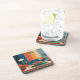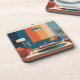 Esta porta copos MCM mostra uma ilustração da sala de estar moderna do século médio com um design de parede de blocos coloridos que tem faixas verticais em azul marinho, laranja queimado e azul-claro. Há uma luz de teto pendente com uma sombra de cúpula teal. A sala contém um sofá azul com pernas de madeira e travesseiros decorativos de laranja. Uma poltrona de terracota senta-se no canto esquerdo, em conjunto com uma lâmpada de chão tripé de madeira com uma sombra de tambor branca. Duas mesas redondas de café de madeira com pernas de metal estão em frente ao sofá. O chão tem um tapete circular com padrão em tons de cor e laranja. A porta copos é uma porta copos de plástico duro com suporte de rolha. Há seis portas copos no set.