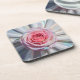 Esta porta copos é uma porta copos opalescente bonito com uma rosa rosa iridescente no centro. Há uma película holográfica iridescente radiando para fora no fundo. As pétalas de rosa são colocadas em camadas em espiral, passando de rosa para rosa mais claro. O fundo holográfico simula um efeito de ruptura com as cores iridescentes, prata, azul, verde e arco-íris. A porta copos é uma porta copos de plástico duro com uma rolha para trás. Há seis portas copos no set.