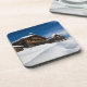 Porta copos de plástico com casal tradicional de cabanas de madeira ou chalés cobertas de neve por um céu azul numa zona de estância de esqui nos Alpes, na Áustria, no inverno.