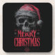 design gráfico arrojado e esbatido com um crânio desenhado à mão, altamente detalhado, que é coroado com um chapéu vermelho de Papai Noel angustiado. A ilustração tem uma aparência pesada, texturizada e levemente espalhada, colocada sobre um fundo de cinza escura. Abaixo do crânio, as palavras "MERRY CHRISTMAS" são apresentadas em tipografia vermelha destacada e estilizada. Este design oferece um alternativo único na temporada de férias.
