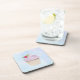 Portas copos com ilustração de um cupcake delicioso com espirais cor-de-rosa e uma baga com folhas aninhadas no glacé. Colocado sobre um fundo de aquarela azul claro.
