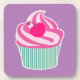 Arte gráfica / ilustração de um cupcake cor-de-rosa brilhante com espirais de gelo em cima e uma cereja bolinhas rosa-quente e giro. A base é verde e listras brancas. Fundo roxo.