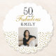 50 and Fabulous Gold Glitter Photo 50th Birthday Party Paper Coaster. The design has faux gold glitter dots, a custom photo and the saying 50 and fabulous in modern script. Make your own 50th birthday party coaster for her. Customize with the name, age and insert your photo into the template.