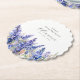 Mesa perfeita para uma festa de aniversário de julho. Larkspur azul (delfinium) é a flor de nascimento desse mês. Ele forma uma bonito borda inferior de aquarela nesta porta copos redonda floral personalizada com bordas recortadas. O nome, a idade e a data de nascimento do celebrante de aniversário são colocados por cima dele usando caligrafia e tipografia elegantes. Todo texto é editável.