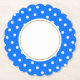 Este design de capricho apresenta um fundo azul brilhante cheio de bolinhas brancas em camadas. Um círculo branco repousa no centro da design.