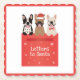 Ilustração de três Bulldog Franceses saindo de uma caixa de correio para cartas para o Papai Noel.