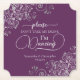 Este porta-copos de casamento é elegante, sofisticado e divertido! Apresenta um belo design cinza-prata e roxo ameixa com letras em estilo moderno e delicados arabescos e espirais em falso foil nos cantos. O texto diz "Por favor, não pegue meu drinque, estou dançando" com espaço para os nomes do casal e a data do casamento na parte inferior. Ótimo souvenir para seus convidados e também uma forma prática de informar aos garçons para não recolherem os drinques ainda!
