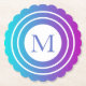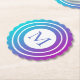 Esta porta copos redonda fofinha personalizada e redimensionada apresenta um design geométrico branco num gradiente multicolorido (turquesa, azul, roxo) com um monograma personalizável na cor azul correspondente.