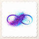 Símbolo infinito com uma bela pena pintada em cores roxas e azuis brilhantes sobre fundo branco.