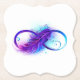 Símbolo do infinito com uma bela pena pintada em cores vibrantes roxas e azuis sobre um fundo branco.