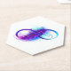 Símbolo do infinito com uma bela pena pintada em cores vibrantes roxas e azuis sobre um fundo branco.