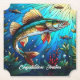 Este design moderno divertido tem um pique colorido de walleye nadando em um belo lago azul num dia ensolarado.