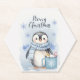 Uma ilustração encantadora de inverno de um adorável pinguim vestindo um chapéu e cachecol listrados, trazendo uma vibração acolhedora e festiva. Os flocos de neve suaves e tons azuis suaves no fundo criam uma atmosfera mágica de inverno. Perfeito para cartões de Natal, posters, adesivos e artesanatos sazonais!