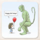 A garota diz feliz aniversário para sua amiga o grande goblin verde.