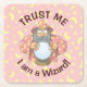 Um velho feiticeiro com capa rosa olhando para a bola mágica de cristal.