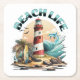 Beach House Décor. Ilustração de uma cena de praia com farol, pranchas, palmeiras e golfinhos.