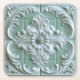 A porta copos tem um aspecto gravado de azulejo floral branco, elegante e cerâmico, sobre fundo verde claro.
