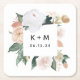 As portas copos de boho chic apresentam uma borda de aquarela quadrada de folhagem botânica verde de sábado e flores de tons de terra pastel em tons de pêssego, marfim e branco, moldando suas iniciais ou monograma e data de evento em letras modernas. Projetado para coordenar com nosso casamento e a coleção de eventos do Boho Blooms.