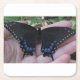 A Linda Borboleta Negra-Maldita. Esta é uma fêmea com suas manchas azuis. Os machos têm amarelo. A planta hospedeira deles é a salsa. Uma das mais belas borboletas, a Borboleta Estadual de Oklahoma. Ela renasceu do casulo cerca de 10 minutos antes da minha fotografia dela na minha mão. Eles têm 6 pernas, corpo preto e asas com manchas de branco nas pontas. Aproveite a adorável borboleta Negra Swallowtail nas Portas copos da minha loja! Fotografia de Copyright por Deborah Carr