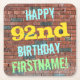 Esta divertida design de porta copos de aniversário apresenta uma mensagem como "FELIZ 92º ANIVERSÁRIO, NOME PRÓPRIO!", onde o nome pode ser personalizado. O fundo apresenta uma representação de uma parede de tijolos constituída por alguns tijolos de cor castanha avermelhada. O texto de mensagem personalizável apresenta cores como azul, amarelo e verde, e tem uma aparência inspirada pela do grafite pintado. Portas copos como estas podem ser úteis como decorações práticas numa festa de aniversário para alguém que comemora o seu 92º aniversário. [~Z0000288]