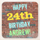 Esta divertida design de porta copos de aniversário apresenta uma mensagem como "FELIZ 24º ANDREW!", onde o nome pode ser personalizado. O fundo apresenta uma representação de uma parede de tijolos constituída por alguns tijolos de cor castanha avermelhada. O texto de mensagem personalizável apresenta cores como azul, amarelo e verde, e tem uma aparência inspirada pela do grafite pintado. Portas copos como estas podem ser úteis como decorações práticas numa festa de aniversário para alguém que comemora seus vinte e quatro anos de aniversário. [~Z0000288]