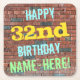 Esta divertida design de porta copos de aniversário apresenta uma mensagem como "FELIZ 32º ANIVERSÁRIO, NOME AQUI!", onde o nome pode ser personalizado. O fundo apresenta uma representação de uma parede de tijolos constituída por alguns tijolos de cor castanha avermelhada. O texto de mensagem personalizável apresenta cores como azul, amarelo e verde, e tem uma aparência inspirada pela do grafite pintado. Portas copos como essas podem ser úteis como decorações práticas em uma festa de aniversário para alguém que comemora seus trinta e dois anos. [~Z0000288]
