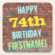 Esta divertida design de porta copos de aniversário apresenta uma mensagem como "FELIZ 74º ANIVERSÁRIO, NOME PRÓPRIO!", onde o nome pode ser personalizado. O fundo apresenta uma representação de uma parede de tijolos constituída por alguns tijolos de cor castanha avermelhada. O texto de mensagem personalizável apresenta cores como azul, amarelo e verde, e tem uma aparência inspirada pela do grafite pintado. Portas copos como estas podem ser úteis como decorações práticas numa festa de aniversário para alguém que comemora seus setenta e quatro anos. [~Z0000288]