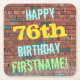 Esta divertida design de porta copos de aniversário apresenta uma mensagem como "FELIZ 76º ANIVERSÁRIO, NOME PRÓPRIO!", onde o nome pode ser personalizado. O fundo apresenta uma representação de uma parede de tijolos constituída por alguns tijolos de cor castanha avermelhada. O texto de mensagem personalizável apresenta cores como azul, amarelo e verde, e tem uma aparência inspirada pela do grafite pintado. Portas copos como estas podem ser úteis como decorações práticas numa festa de aniversário para alguém que comemora seus setenta e seis anos. [~Z0000288]