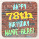 Esta divertida design de porta copos de aniversário apresenta uma mensagem como "FELIZ 78º ANIVERSÁRIO, NOME AQUI!", onde o nome pode ser personalizado. O fundo apresenta uma representação de uma parede de tijolos constituída por alguns tijolos de cor castanha avermelhada. O texto de mensagem personalizável apresenta cores como azul, amarelo e verde, e tem uma aparência inspirada pela do grafite pintado. Portas copos como estas podem ser úteis como decorações práticas numa festa de aniversário para alguém que comemora seus setenta e oito anos. [~Z0000288]