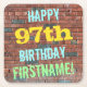 Esta divertida design de porta copos de aniversário apresenta uma mensagem como "FELIZ 97º ANIVERSÁRIO, NOME PRÓPRIO!", onde o nome pode ser personalizado. O fundo apresenta uma representação de uma parede de tijolos constituída por alguns tijolos de cor castanha avermelhada. O texto de mensagem personalizável apresenta cores como azul, amarelo e verde, e tem uma aparência inspirada pela do grafite pintado. Portas copos como essas podem ser úteis como decorações práticas em uma festa de aniversário para alguém que comemora seu 90° aniversário. [~Z0000288]