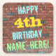Esta divertida design de porta copos de aniversário apresenta uma mensagem como "FELIZ 4º ANIVERSÁRIO, NOME AQUI!", onde o nome pode ser personalizado. O fundo apresenta uma representação de uma parede de tijolos constituída por alguns tijolos de cor castanha avermelhada. O texto de mensagem personalizável apresenta cores como azul, amarelo e verde, e tem uma aparência inspirada pela do grafite pintado. Portas copos como estas podem ser úteis como decorações práticas numa festa de aniversário para alguém que comemora seu quarto aniversário. [~Z0000288]