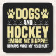 A porta copos do tema do hóquei com texto que lê Cachorros e Hockey me fazem feliz ser humano me machuca! Também mostra alguns bastões de hóquei e estampas de pata de cachorro!