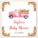 Este lindo e divertido porta-copos para chá de bebê em aquarela apresenta um caminhão rústico rosa cheio de morangos. O texto combina fontes manuscritas e sem serifa para uma aparência elegante e moderna. Isso é perfeito para um chá de bebê de verão.