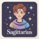 Esta porta copos apresenta um bonitinho personagem zodíaco sexualmente radiante e charme. É um jovem com cabelos de auqueia, estilizado de forma endêmica, com ouro metálico, glifo sagitário, na testa, e vestindo uma roupa macia, gradiente, azul e roxa, representando cores sagittárias. Em fundo índio estão brilhando estrelas azuis, lavandas e douradas criando fundo celeste, com a palavra Sagittarius na na moda, texto moderno na base. A porta copos é uma porta copos de pasta de papel quadrada. Há seis portas copos no conjunto de portas copos.
